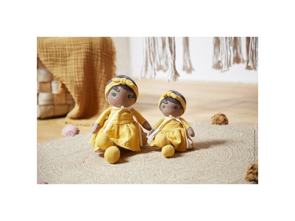 Toto je Naomie, milá bábika vo farebných tónoch o veľkosti 32 cm. Je to veľmi pekná mladá dáma s jemnými bavlnenými mušelínovými šatami v slnečných farbách. Výšivka sedmokrásky evokuje nevinnosť a úprimnosť, charakteristické črty Naomie. Jej voľné šaty a čižmičky sú ideálne na šantenie sa na sedmokráskových poliach. Naomie odráža bezstarostnú a radostnú povahu, ktorou poteší tých najmenších. Je to skvelý darček k narodeniu, elegantný svojou striedmosťou a novým materiálom. Vďaka malej veľkosti si ju môžete vziať všade so sebou. Dlhá stuha na zadnej strane umožňuje napísať meno dieťatka, aby bola ešte viac jedinečná. Možno prať v práčke. Vhodné už od narodenia.