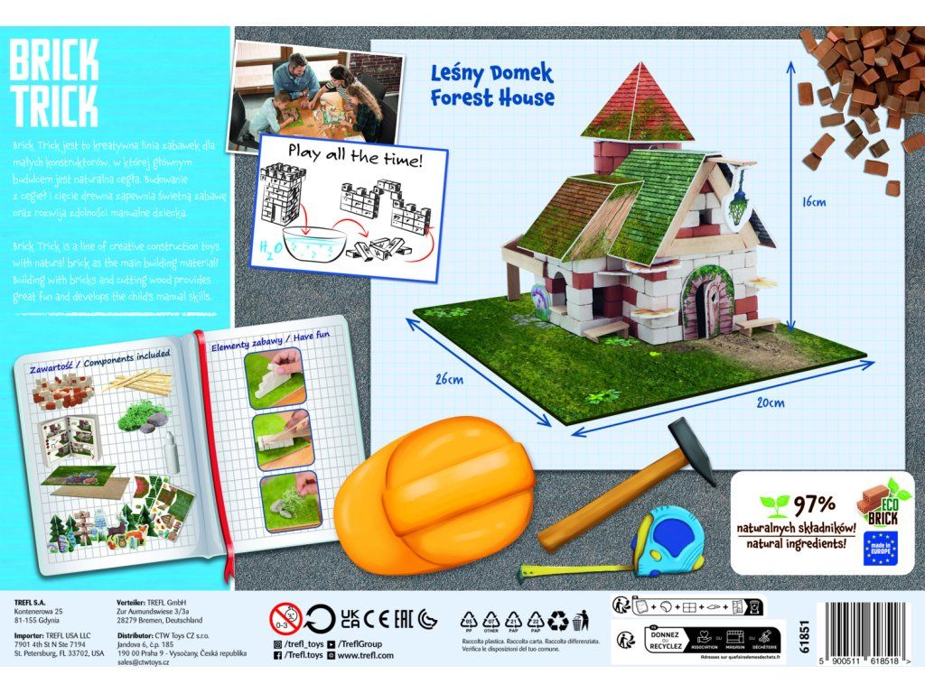 Postavte si lesný dom pomocou skutočných tehál, dreva a dekoratívnych prvkov. Použite priložené stavebné plány alebo použite svoju fantáziu na vytvorenie jedinečnej konštrukcie. Tam zábava nekončí! Rozpustite štruktúru vo vode a pokračujte v stavaní s rovnakými tehlami! Balenie obsahuje: skutočné tehly, drevené dosky, lepidlo, ozdobné prvky, stojan, nálepku a návod. Záleží nám na životnom prostredí, preto sada obsahuje 97% prírodných zložiek!