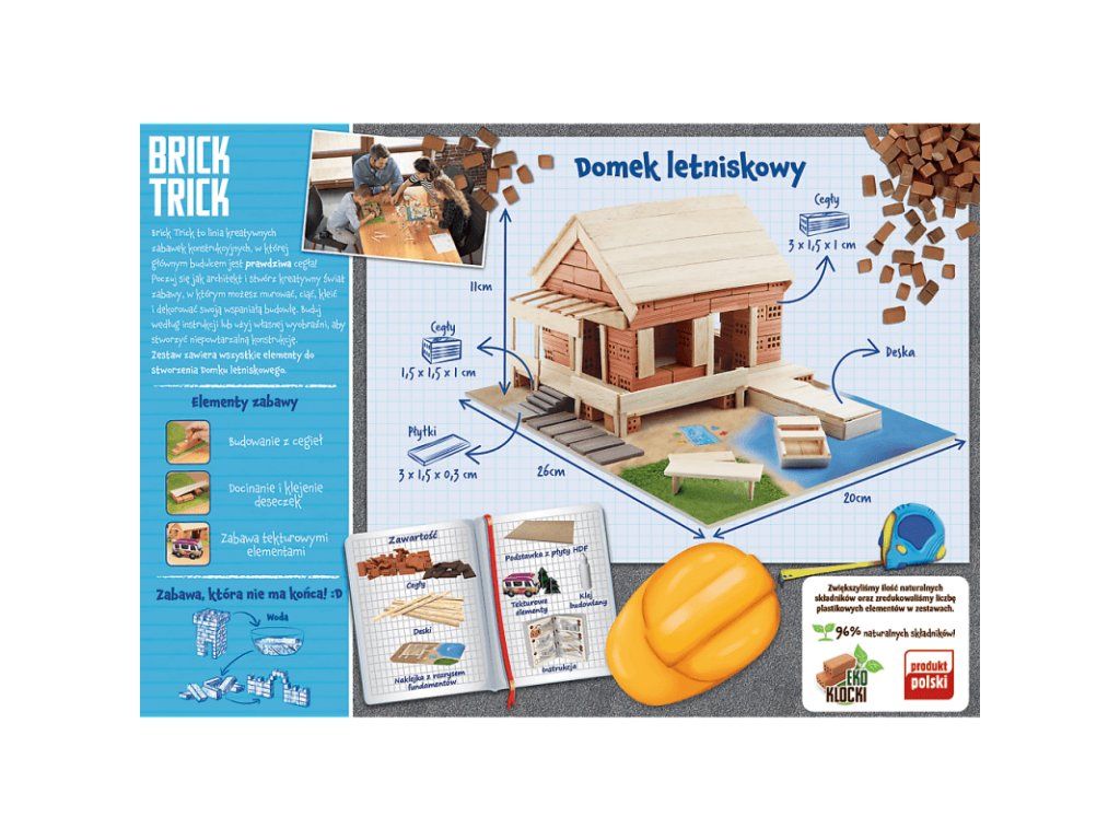 Postavte si letný dom pomocou skutočných tehál, dreva a dekoratívnych prvkov. Použite priložené stavebné plány alebo použite svoju predstavivosť a vytvorte si vlastnú jedinečnú štruktúru. Tam zábava nekončí! Rozpustite štruktúru vo vode a pokračujte v stavbe opätovným použitím tých istých tehál! V balení nájdete: skutočné tehly, drevené dosky, lepidlo, ozdobné prvky, základňu, nálepku a návod. Záleží nám na životnom prostredí, a preto sada obsahuje 96% prírodných zložiek! EKO bloky = zaručená zábava!