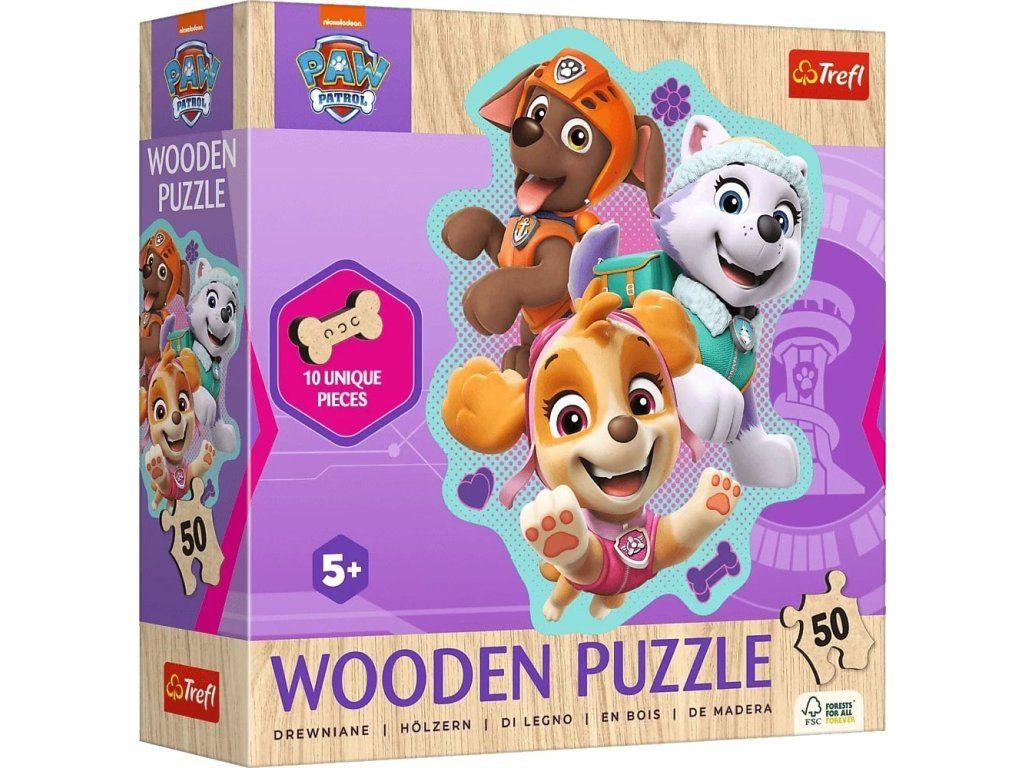 Drevené puzzle TREFL so špeciálne tvarovanými dielikmi. Puzzle je vyrobené zo silnej drevovláknitej dosky a vyrezané laserom, vďaka čomu sú okraje hladké a dieliky do seba ľahko zapadajú.