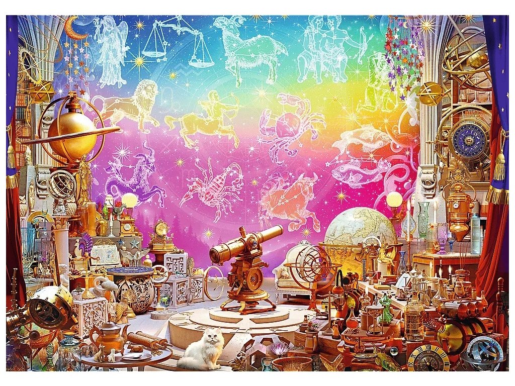 Vesmír a kryštály je puzzle zobrazujúce magické observatórium a farebné kamene.