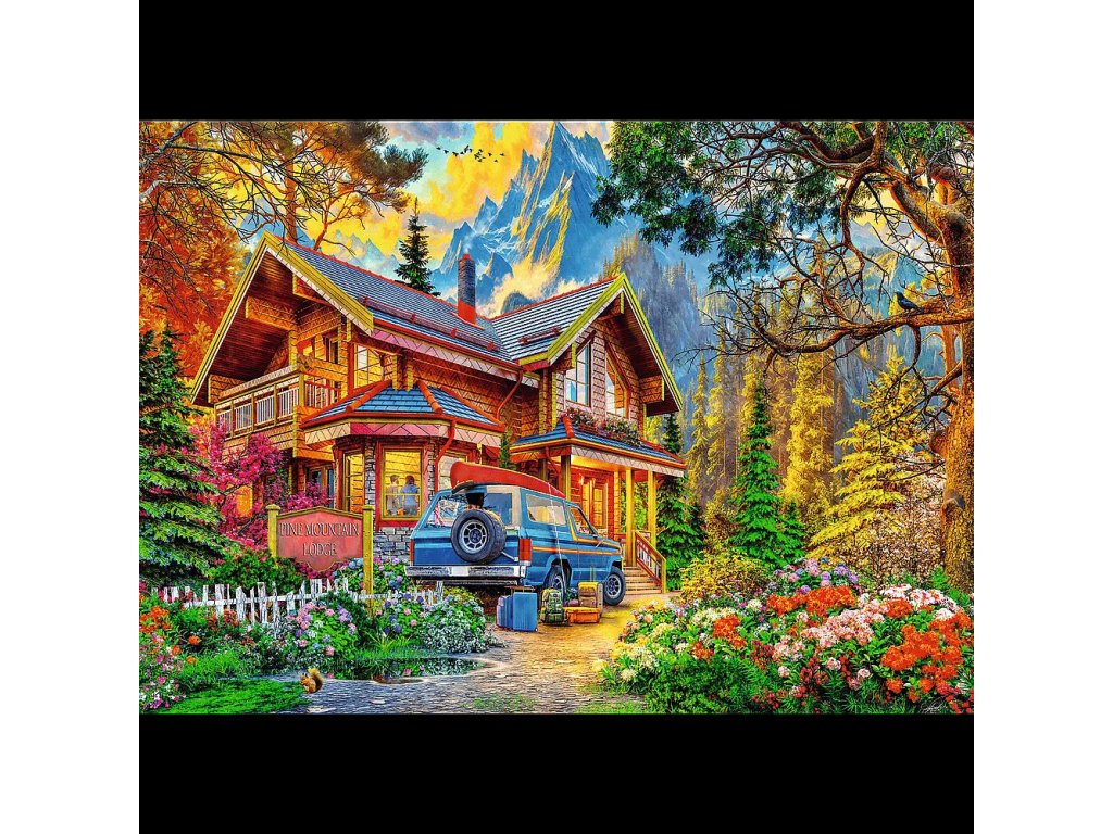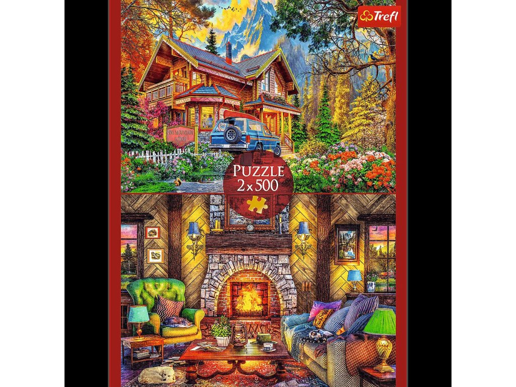 Puzzle 2x500 sú dve 500-dielne puzzle v jednom balení ! Výlet do hôr je skladačka zobrazujúca dom na pozadí hôr a interiér chaty s krbom. Každá skladačka vytvorí obrázok s rozmermi 480x340 mm.