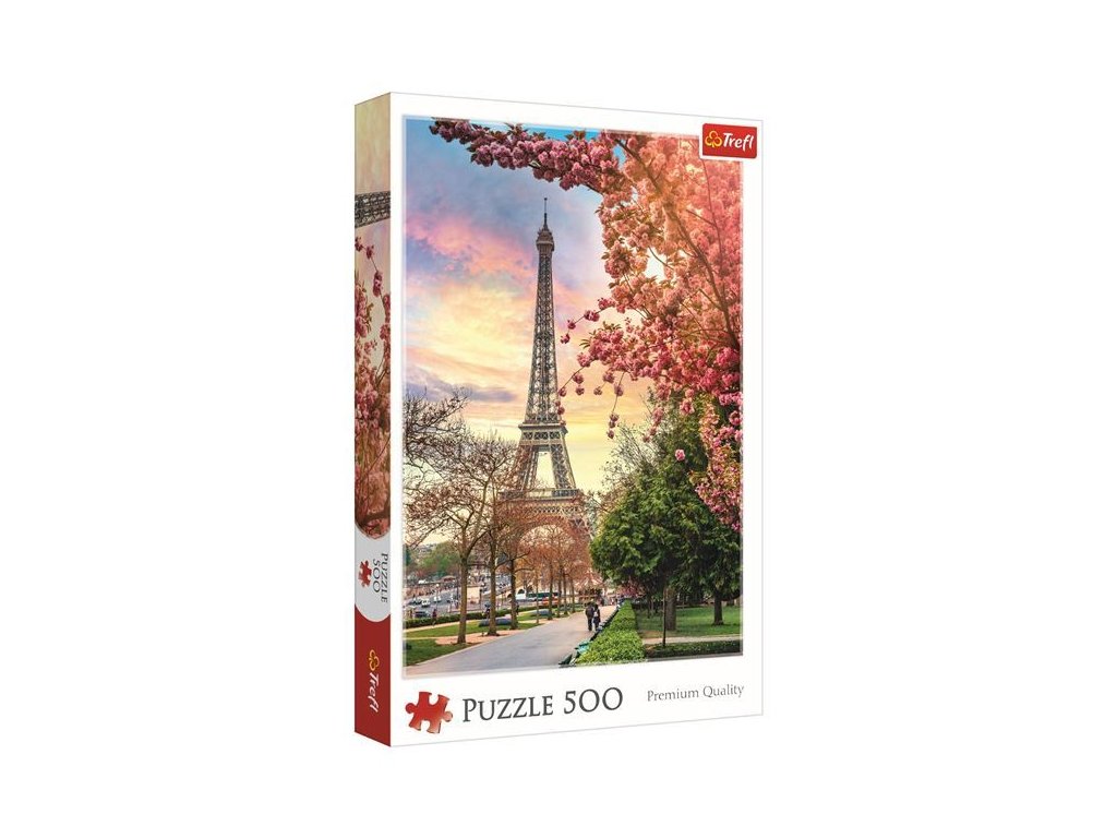 Trefl Puzzle s 500 dielikmi zobrazujúcimi Eiffelovu vežu v Paríži počas kvitnutia.